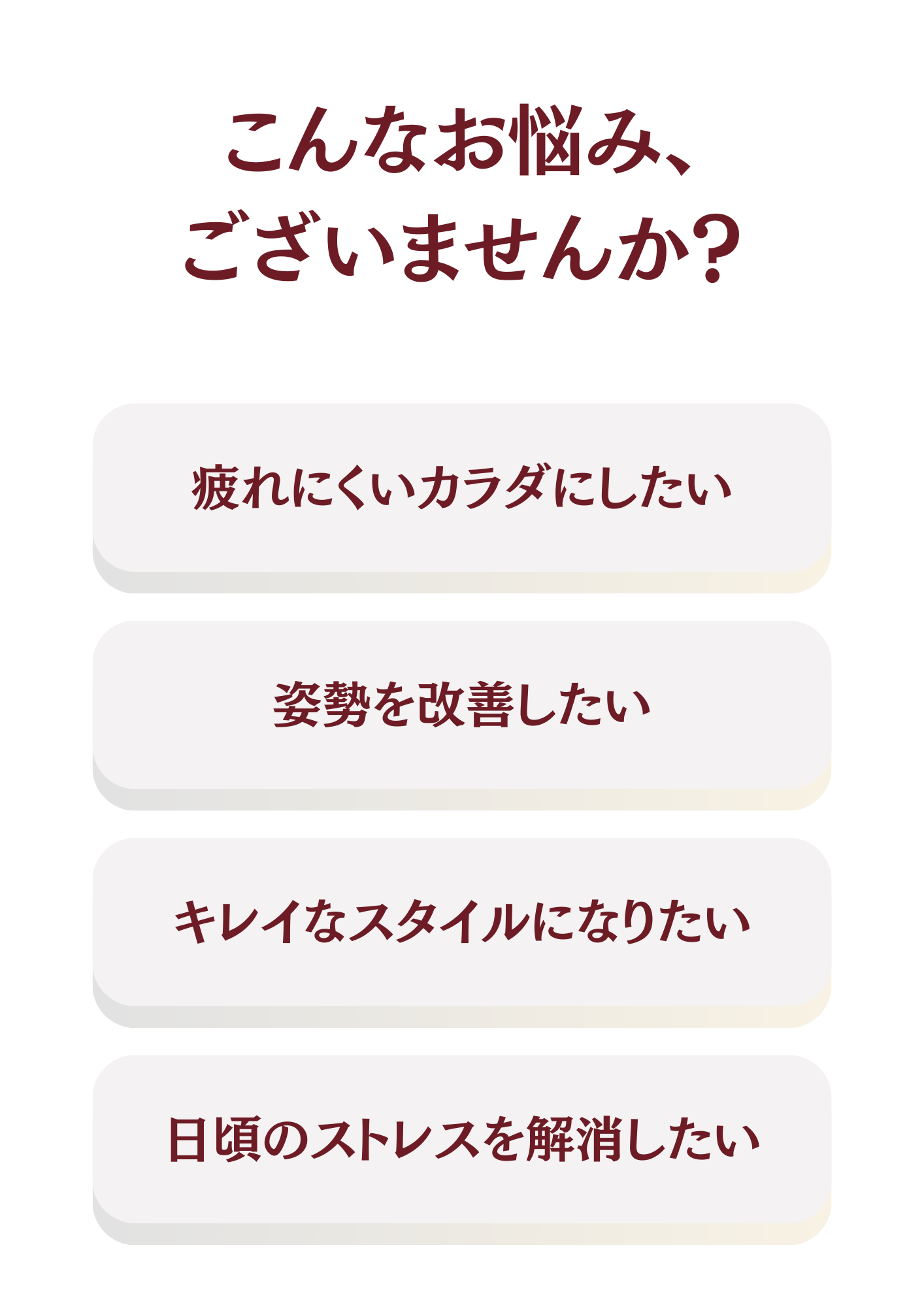 カラダの歪みの原因や不調がどこからきているのかをカラダの深部からしっかりアプローチ。原因を継続的に解消していきます。そしてあなただけのオーダーメイドレッスンで、キレイなボディライン、理想の美しい女性をここネストで手に入れましょう。